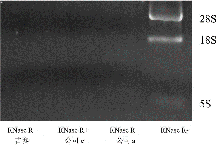 将10U RNase R加入到2.5 μg total RNA中,于37℃孵育30 min,之后直接进行电泳检测,结果显示RNase R+组28/18/5S条带变淡(不可见),表明RNase R对total RNA的消化作用。吉赛和公司e或公司a的RNase R对total RNA消化效果相当。