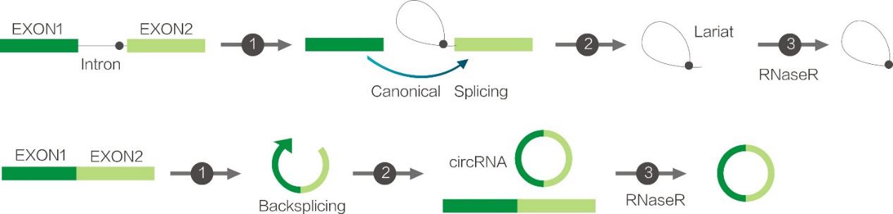RNase R (Ribonuclease R)是一种来源于大肠杆菌RNR超家族的3’-5’核糖核酸外切酶,可从3’-5’方向将RNA逐步切割成二核苷酸和三核苷酸。RNase R可消化几乎所有的线性RNA分子,但不易消化环形RNA、套索结构或3’突出末端少于7个核苷酸的双链RNA分子。RNase R常用于基因表达和可变剪切研究,可消化线性RNA以使环形RNA (circRNAs)或套索结构RNA (lariat RNA)得到富集。