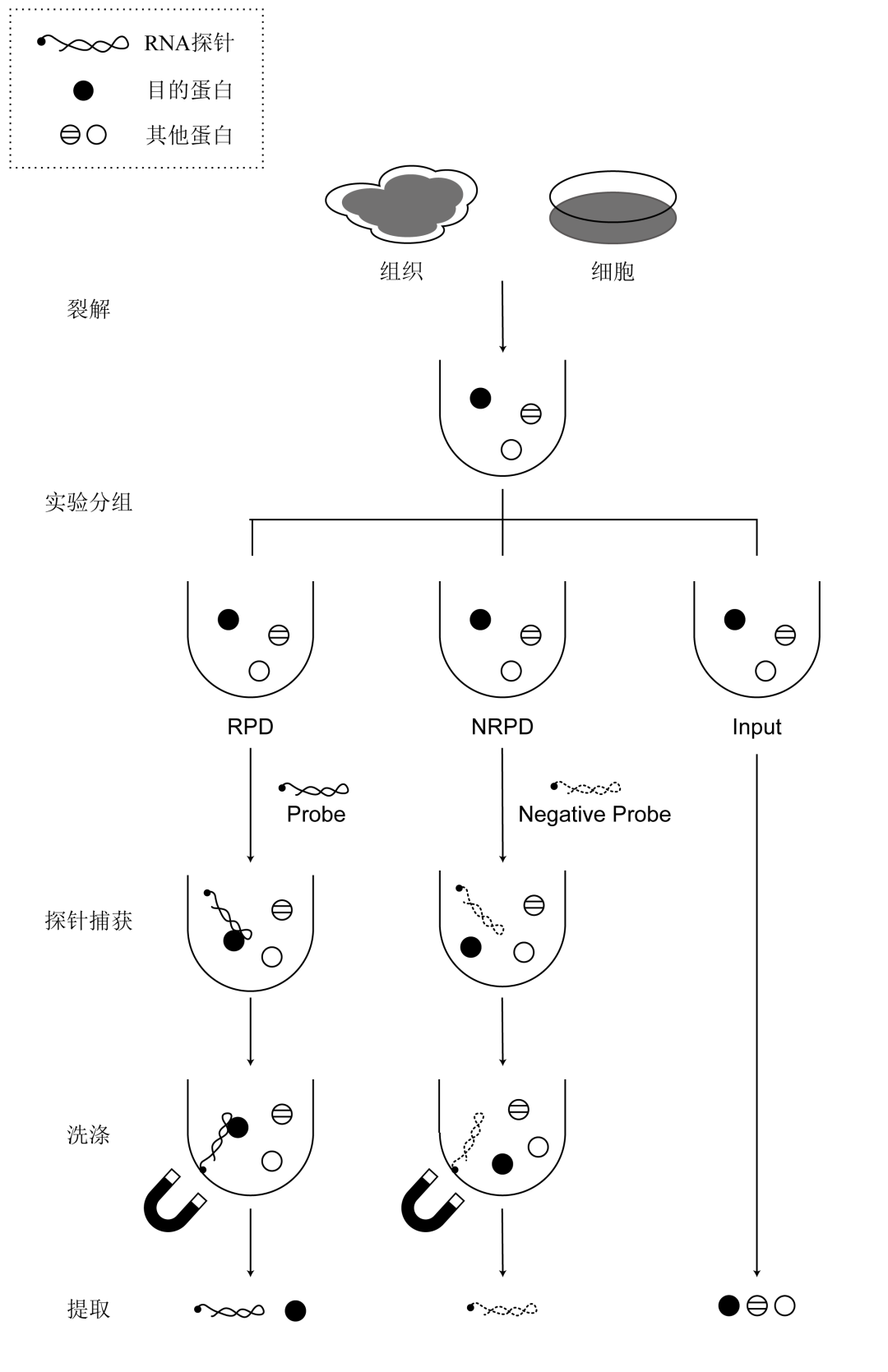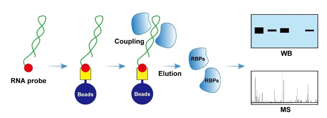 RNA pull-down是检测RNA结合蛋白与RNA之间相互作用的主要实验手段之一。该技术利用体外合成生物素标记RNA模拟天然RNA分子,作为探针,与细胞裂解液孵育。探针与裂解液中的蛋白形成RNA-蛋白质复合物,可被链霉亲和素磁珠特异性结合捕获,从而实现RNA结合蛋白(RBPs)的捕获富集。