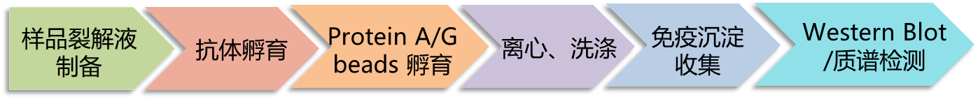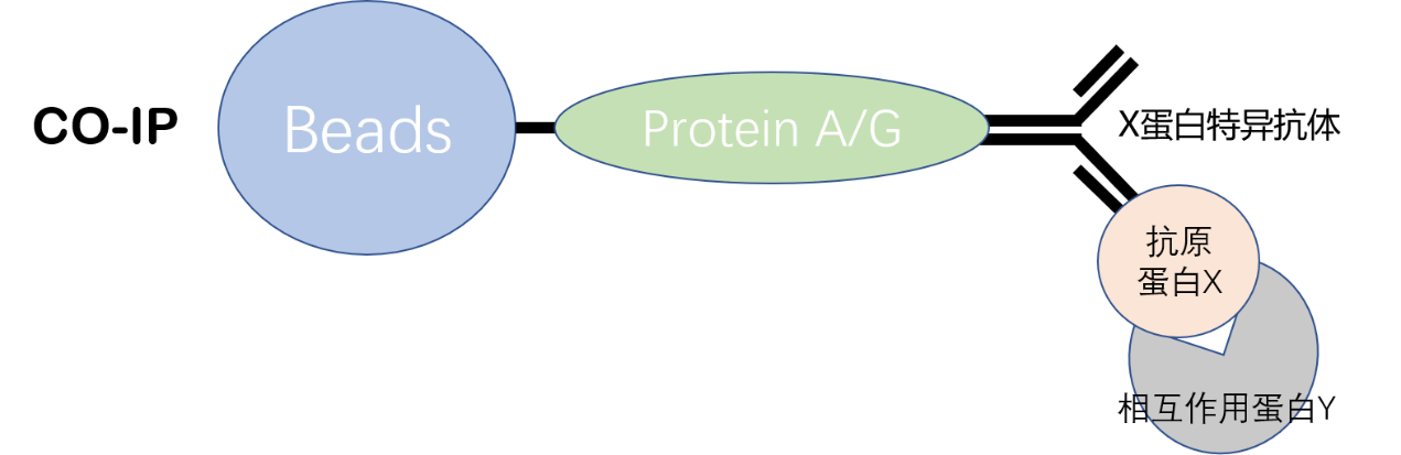 免疫共沉淀技术原理是以细胞内源性靶蛋白(protein X)为诱饵,将protein X的抗体与细胞总蛋白进行共孵育,促进免疫复合物的形成;随后加入能够与抗体Fc段结合的protein A/G(预先结合固化在琼脂糖微珠上),这样在protein X所在的环境中与其有相互作用的蛋白(protein Y)会被一起沉淀下来,形成"结合蛋白-靶蛋白-靶蛋白抗体-protein A/G微珠"复合物,纯化该复合物后凝胶电泳分离蛋白,应用Western blot 或者质谱技术鉴定靶蛋白的结合蛋白。