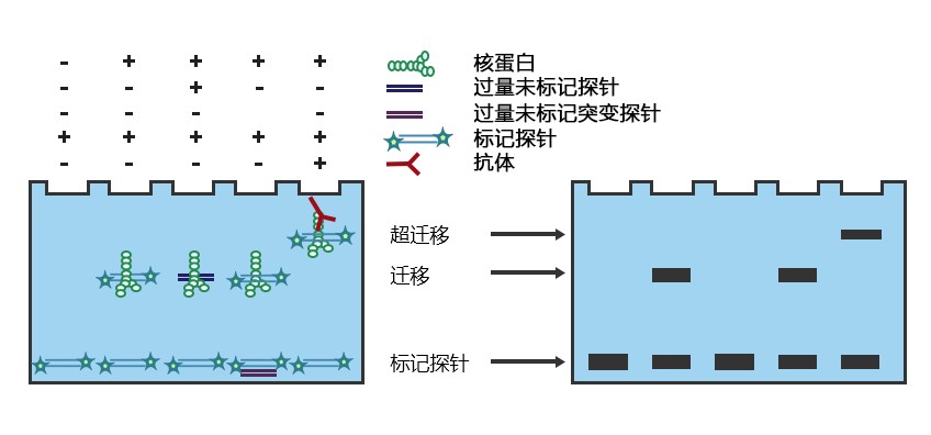 基于DNA-蛋白质或RNA-蛋白质复合体在聚丙烯酰胺凝胶电泳(PAGE)中有不同迁移率的原理,当转录因子与特异的DNA或RNA结合后,其在PAGE中的迁移率将小于未结合核蛋白转录因子的DNA,从而检测到活化的与DNA或RNA结合的蛋白转录或调节因子。