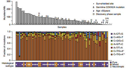 促结缔组织增生性黑色素瘤是一种罕见的黑色素瘤。作者对62名促结缔组织增生性黑色素瘤患者进行了基因组、外显子组测序,随后对其中的42个病例的293个基因进行靶向测序。