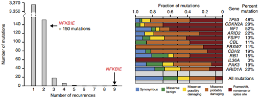 促结缔组织增生性黑色素瘤是突变率最高的癌症之一,62个肿瘤样本中突变率中位数是62突变/Mb,而普通皮肤黑色素瘤的突变率大约只有15突变/Mb。在促结缔组织增生性黑色素瘤中,88%的突变为C>T的碱基置换,说明紫外线照射是主要的诱变因素。通过筛选富集样本中多次出现的突变,找到了新的致病突变基因NFKBIE,确定了导致功能缺失的基因突变(如截断突变、错义突变)。