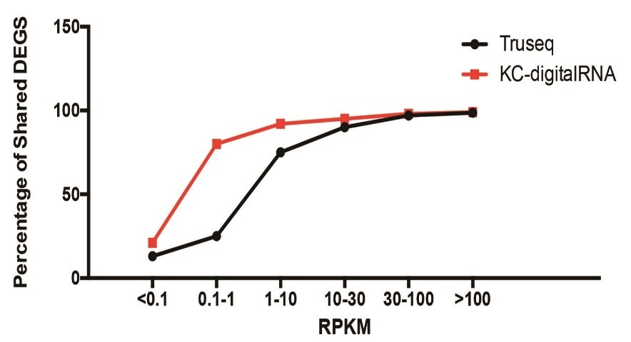 通过对2个样品间的差异基因进行重复检测,左图为不同批次检测结果间一致性的展示。使用普通建库方法,表达量较低的基因,检测结果的重复性较差(黑色),使用KC-digitalRNA对重复进行处理后,中低表达量基因表达差异批次间检出的一致性有显著提高。