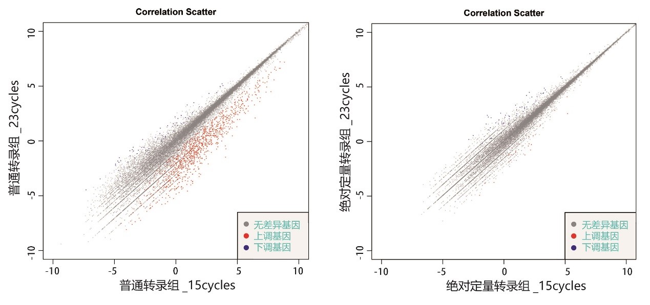 左图:使用普通RNA建库试剂盒对同一个样品在不同扩增条件下获得的基因表达的一致性; 右图:使用KC-digitalRNA建库试剂盒对同一个样品在不同扩增条件下获得的基因表达的一致性。