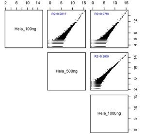 分别使用100ng、500ng、1ug作为建库起始量,并将不同建库起始量的测序结果进行相关性分析。