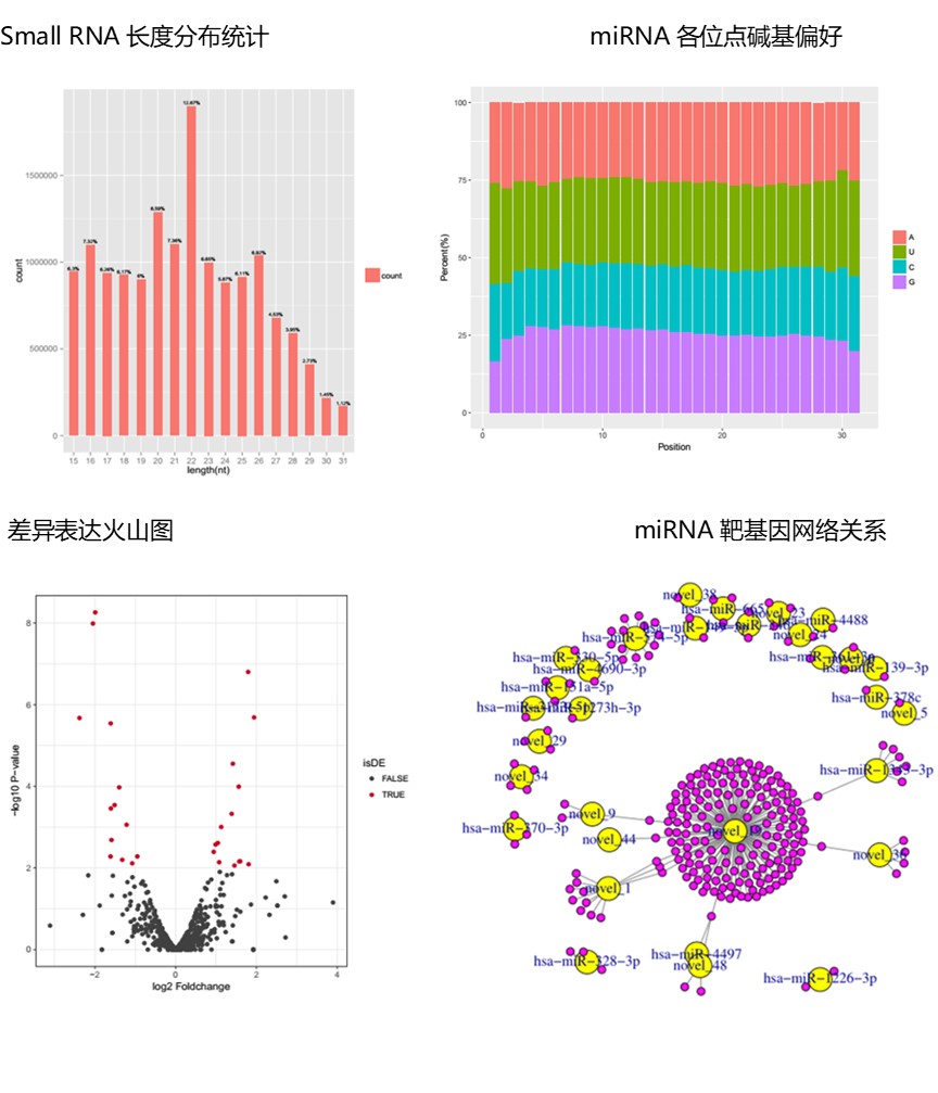 小RNA是指一类高度保守的长度为18-32nt的RNA分子,主要包括miRNA、siRNA、snoRNA和piRNA等,是生命活动重要的调控因子,在基因表达调控、生物个体发育、代谢及疾病的发生等生理过程中起着重要的作用。研究表明, 包括癌症、心血管疾病、免疫系统疾病在内的多种疾病与miRNA 的调控作用密切相关。近年来, 由于小RNA测序技术的应用,越来越多的miRNA被发现和功能鉴定,并将广泛应用于疾病诊断、个性化治疗和预后等领域。Small RNA测序能鉴定和定量解析已知small RNA,并预测新的small RNA及预测small RNA的靶基因,是研究small RNA的功能和调控机制的有力工具。