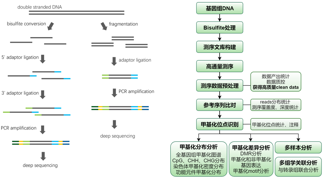 全基因组甲基化测序(Whole Genome Bisulfite Sequencing,WGBS)是将重亚硫酸盐(Bisulfite)处理方法和Illumina高通量测序平台相结合,对有参考基因组信息的物种进行全基因组范围内的甲基化水平的测序。Bisulfite处理能够将基因组中未甲基化的C碱基与甲基化的C碱基区分开来,因此成为表观遗传学研究的经典实验方法。WGBS能够绘制单碱基分辨率的DNA甲基化图谱,可用于研究物种特定DNA区域甲基化与特定表型之间的关联,并进一步研究环境、营养以及其他因素对特定基因甲基化的影响,为人类疾病的发生、治疗,以及动植物分子育种等提供研究基础。