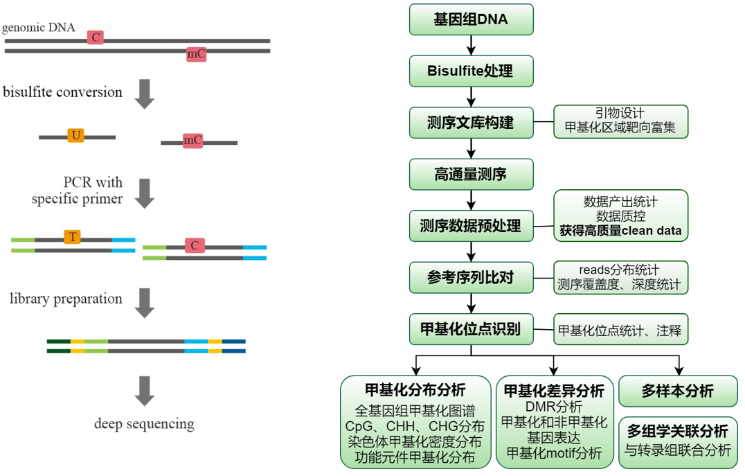 Bisulfite(亚硫酸氢盐)处理是表观遗传学研究的经典实验方法,能够将基因组中未甲基化的胞嘧啶转化成尿嘧啶,通过PCR进一步转化成胸腺嘧啶,而甲基化的胞嘧啶保持不变。目标区域甲基化测序(Targeted Region Bisulfite Sequencing)首先将Bisulfite处理基因组DNA,然后在目标区域两侧设计PCR引物并对目标区域进行扩增,对PCR扩增产物进行测序就可以判断目标区域CpG位点是否发生甲基化修饰。