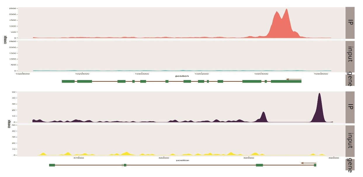 选取筛选到Peak的基因,作图展示比对到该基因的reads的覆盖深度分布,横坐标表示基因位置,纵坐标为reads数(reads count)‘