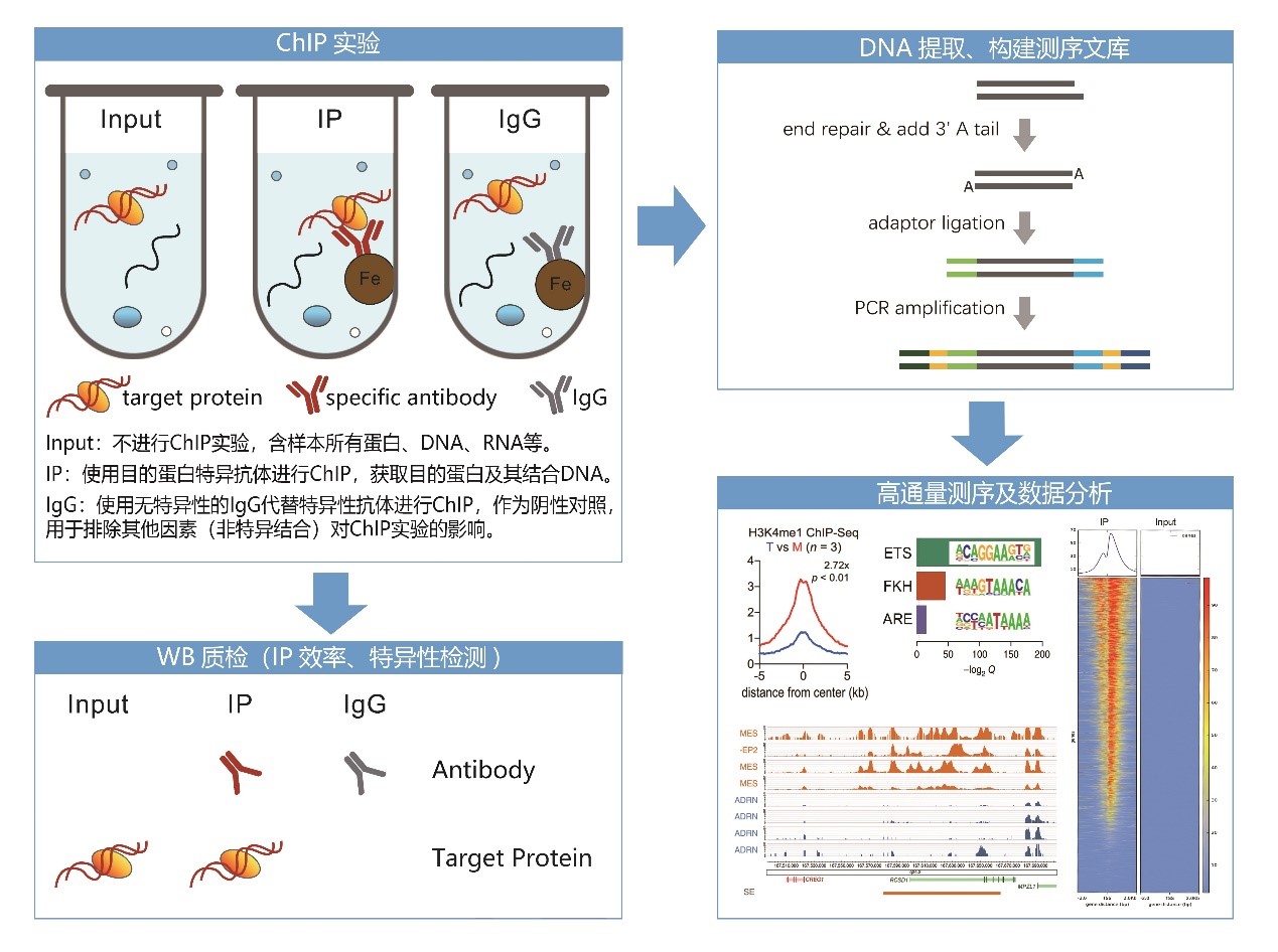 ChIP测序(Chromatin immunoprecipitation and high-throughput sequencing,ChIP-seq)是将染色质免疫沉淀与高通量测序相结合的技术,通过蛋白免疫相互作用, 用抗体把和染色质相互作用的蛋白(如组蛋白、 转录因子等)沉淀下来, 从而获取与其结合的 DNA 序列,捕捉到细胞内动态的、瞬时的组蛋白与DNA之间的相互作用,从而所获取与其相结合的DNA序列,确定修饰组蛋白在染色质上的具体位置。可以一次性得到修饰组蛋白在整个基因组上的结合分布,得到修饰组蛋白精确的结合位点以及结合基序等信息。