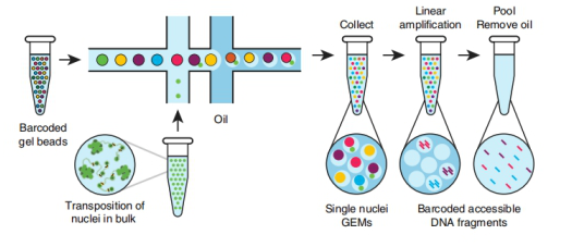 10x scATAC-seq基于GemCode微流体平台,首先利用转座酶混合液孵育细胞核悬液,转座酶进入细胞核,优先在切割开放染色质区域使DNA片段化,并在DNA片段的末端添加测序引物;其次,带有标签(Barcode)的凝胶珠(GelBeads)和单个细胞核包裹在油滴中,形成GEMs;随后凝胶珠溶解,细胞核裂解释放DNA片段,并在片段末端加上标签;GEMs破裂后,回收带有标签的DNA,构建文库;最后,利用Illumina测序平台对文库进行高通量测序。