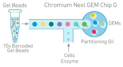 然后,gel beads与细胞、酶的混合物混合,然后在位于微流体“双十字”交叉系统中与油表面活性剂溶液结合,形成GEMs(Gel Bead-In-Emulsions)。
