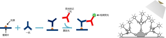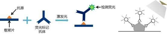 免疫荧光是根据抗原、抗体的反应原理,先将已知的抗原或抗体标记上荧光素制成荧光标记物,再用这种荧光抗体(或抗原)作为分子探针检测细胞或组织内的相应抗原(或抗体)。在细胞或组织中形成的抗原抗体复合物上含有荧光素,利用荧光显微镜观察样本,荧光素受激发光的照射而发出明亮的荧光(黄绿色或桔红色),由此可以观察荧光所在的细胞或组织,从而对抗原或抗体进行定性、定位,以及利用定量技术进行定量。